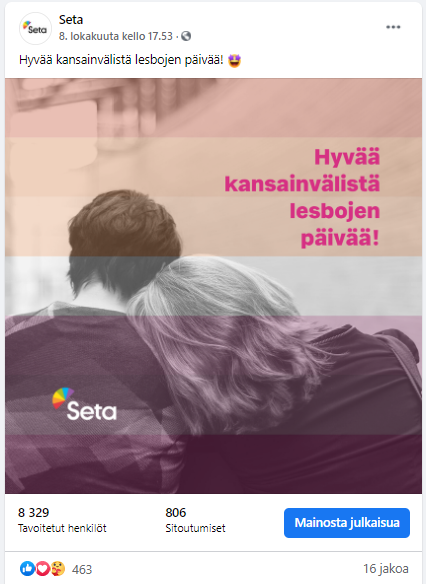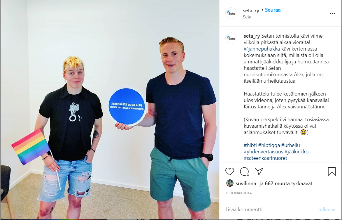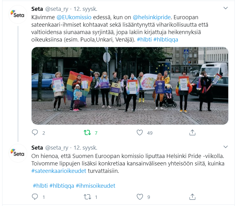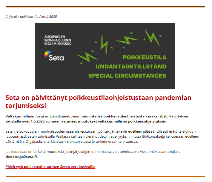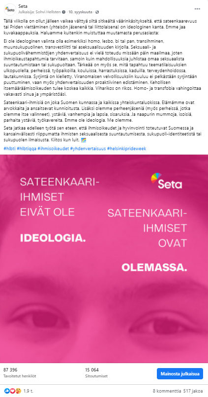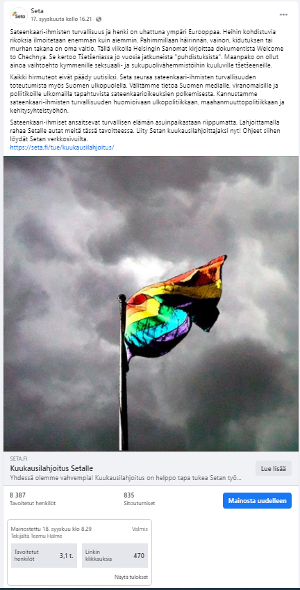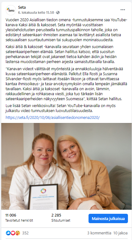 Esimerkkejä Setalle tekemistäni somejulkaisuista, kanavina Facebook, Instagram ja Twitter. Joukossa on myös pari uutiskirjeartikkelia.